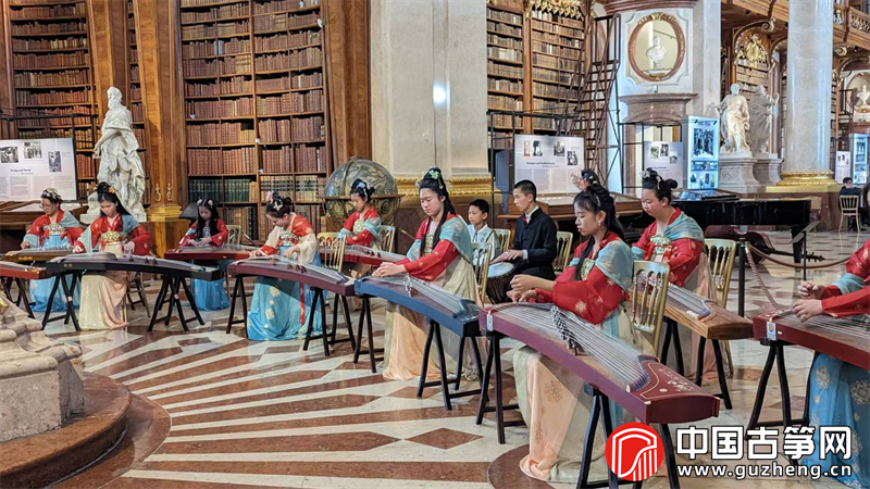 乐团在此次演出中演绎了中国当代著名作曲家王丹红的《沙漠玫瑰》——这首融合西域意象的古筝重奏曲,通过细腻的指法与张力十足的节奏变化,在巴洛克式图书馆穹顶下营造出一种奇妙的文化对话氛围。演奏者身着汉服,与图书馆宏伟典雅的建筑风格相得益彰,仿佛构筑出一个“东方遇见西方”的时空舞台。音乐在书香与历史之间回响,令观众仿佛置身于一场穿越古今的文化旅程。