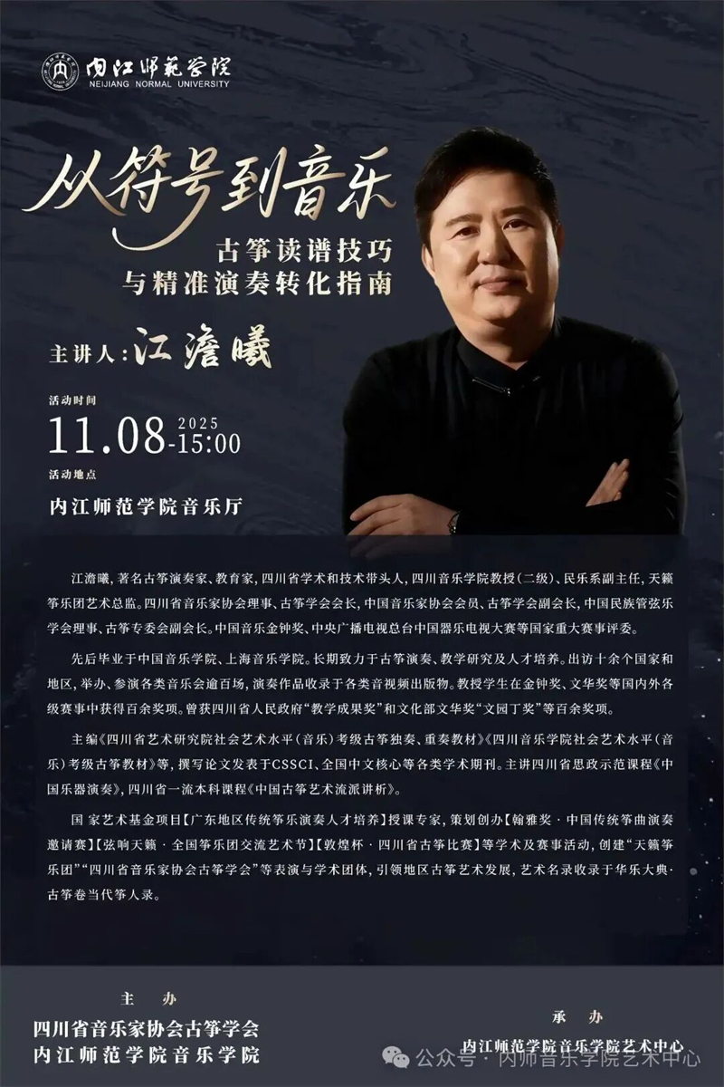 为弘扬蜀筝艺术,履行学会推广职责,“四川筝会·筝艺传薪”系列首场活动于11月8日在内江师范学院音乐厅正式启航。四川省音乐家协会古筝学会会长江澹曦教授,带来了题为《从符号到音乐:古筝读谱技巧与精准演奏转化指南》的专题讲座。