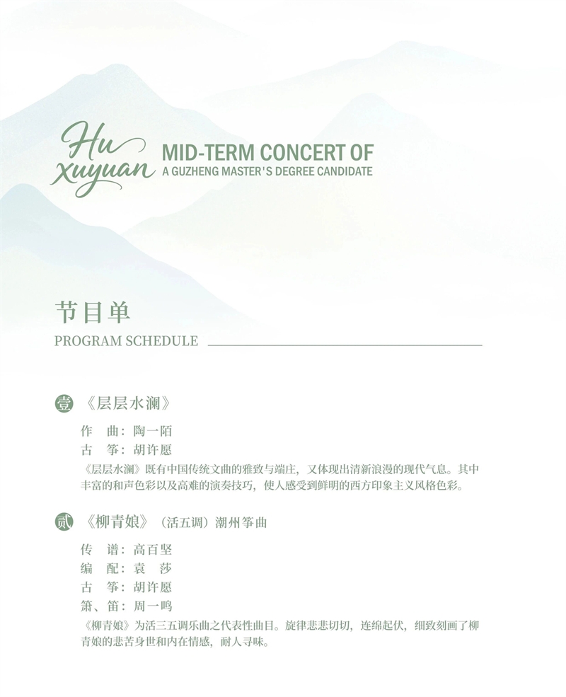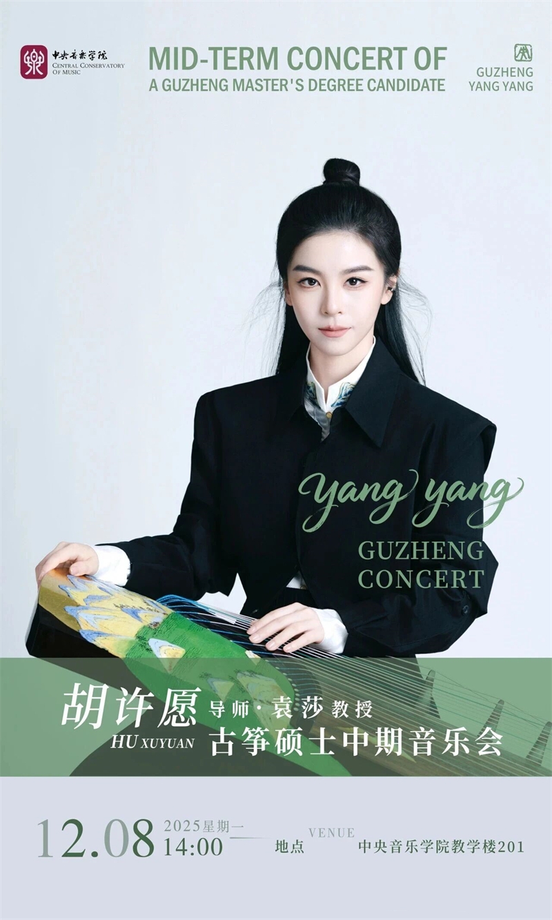 12月8日,胡许愿(央央)古筝硕士中期音乐会将于中央音乐学院教学楼201上演,届时邀您共赴一场古筝硕士的中期答卷。
