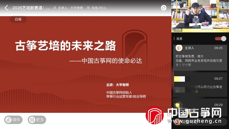 他阐述了中国古筝网的核心计划:推动古筝回归美育本源,通过“免费学”扩大行业基础流量,并积极拓展跨界业务:如疗愈、大健康等项目,反哺古筝生态。